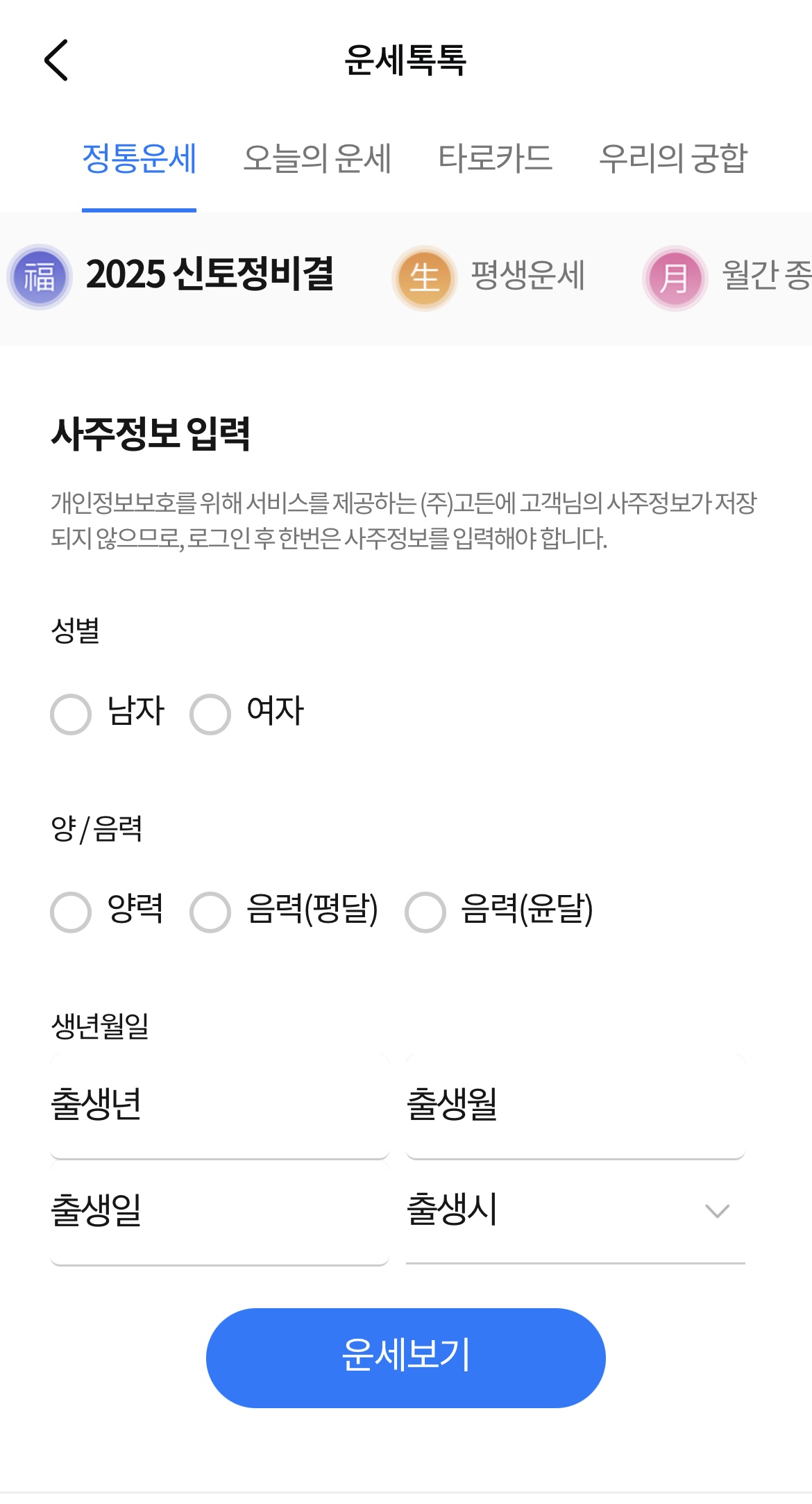 원하는 운세 서비스를 선택하고 성별, 생년월일, 태어난 시를 입력하면 결과를 확인할 수 있습니다.
