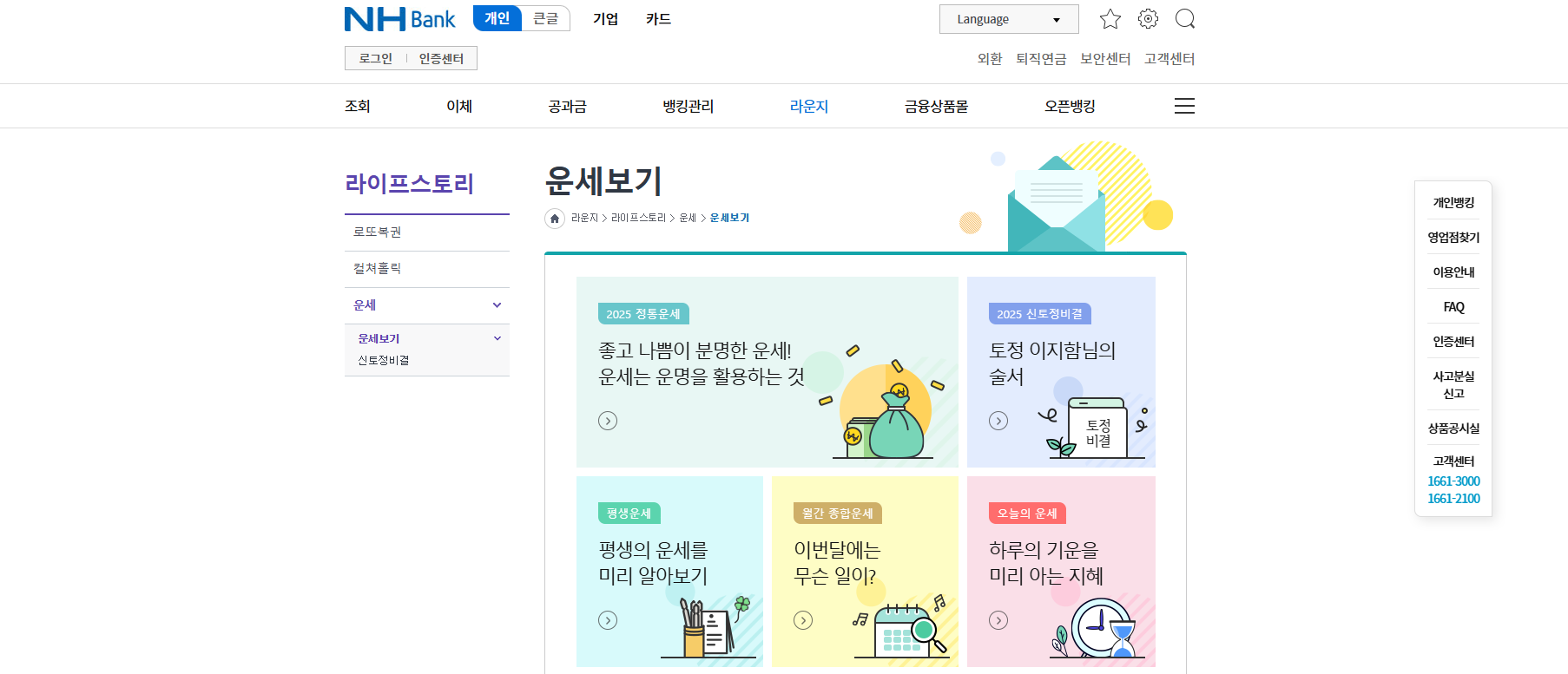정통 운세(월간 종합 운세, 평생 운세, 2025 신토정비결, 2025 부자되기), 생활운세(오늘의 운세, 주간 종합운세, 오늘의 타로, 프리미엄 로또운세), 애정/궁합(내사랑 반쪽찾기, 내 운명의 배우자, 프리미엄 궁합)을 조회해볼 수 있는 서비스가 있습니다.
