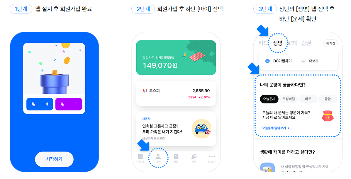 어플 하단 마이 → 상단에 생명탭 선택 → 하단으로 내려 운세톡톡 확인